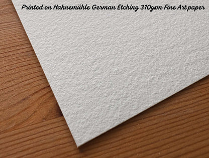 This is a museum-quality giclée art print produced on Hahnemühle German Etching 310gsm Fine Art paper. This heavyweight paper has a luxurious, velvety textured surface that enhances colour depth and detail, giving the artwork a rich, gallery-worthy finish. Printed with Epson Claria ET Premium inks, the result offers fade resistance of up to 100 years in albums and several decades on display, so your print can be enjoyed for many years to come.