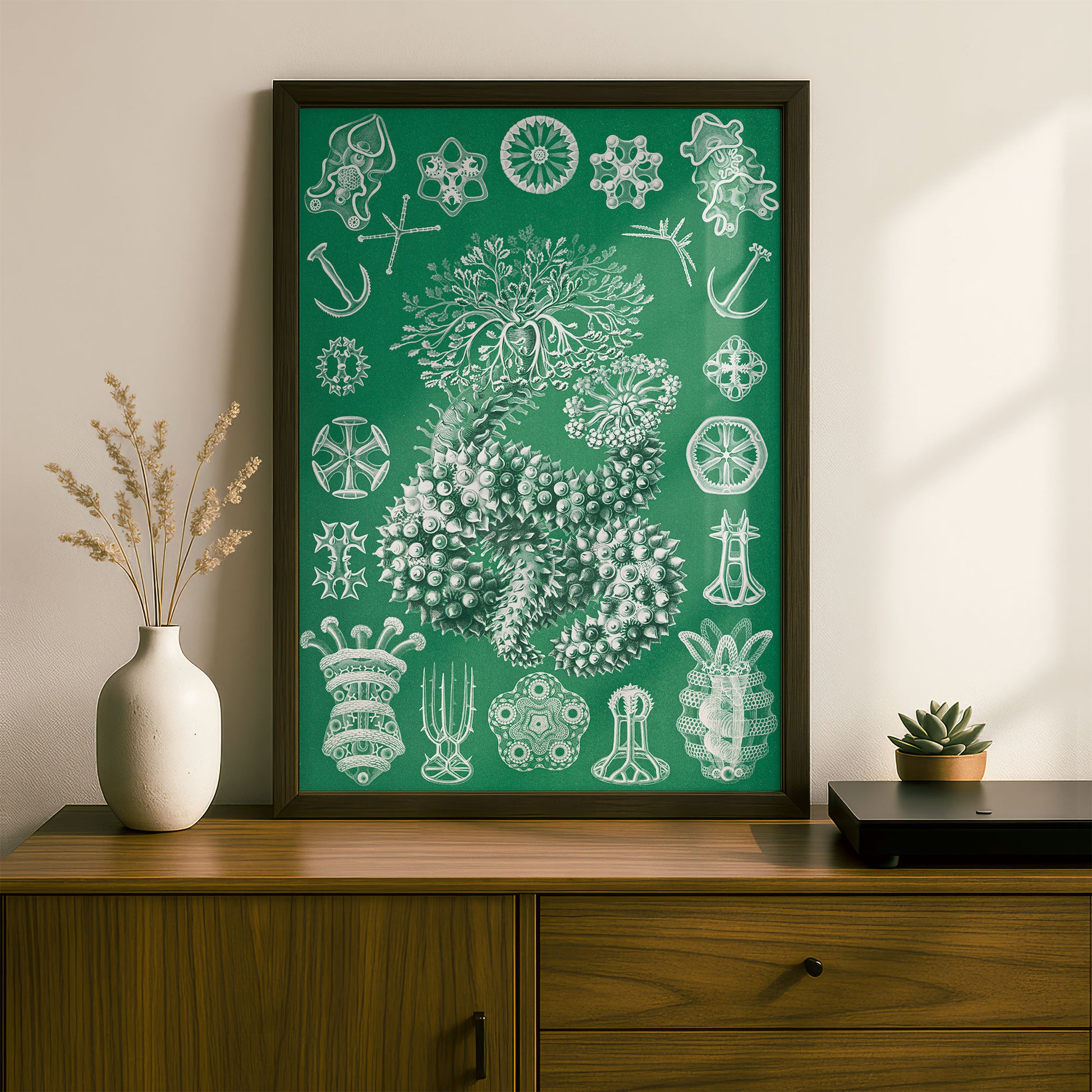 Haeckel's enduring work perfectly marries accuracy and imagination — detailed scientific records rendered with an artist's eye for colour, composition, and drama. His intricate patterns and bold use of colour feel strikingly contemporary, making century-old illustrations of diatoms and sea creatures look like they could hang in any modern space. Whether you're drawn to natural history, love bold graphic design, or simply want something genuinely unique on your walls, Haeckel's work delivers visual impact that never gets old.