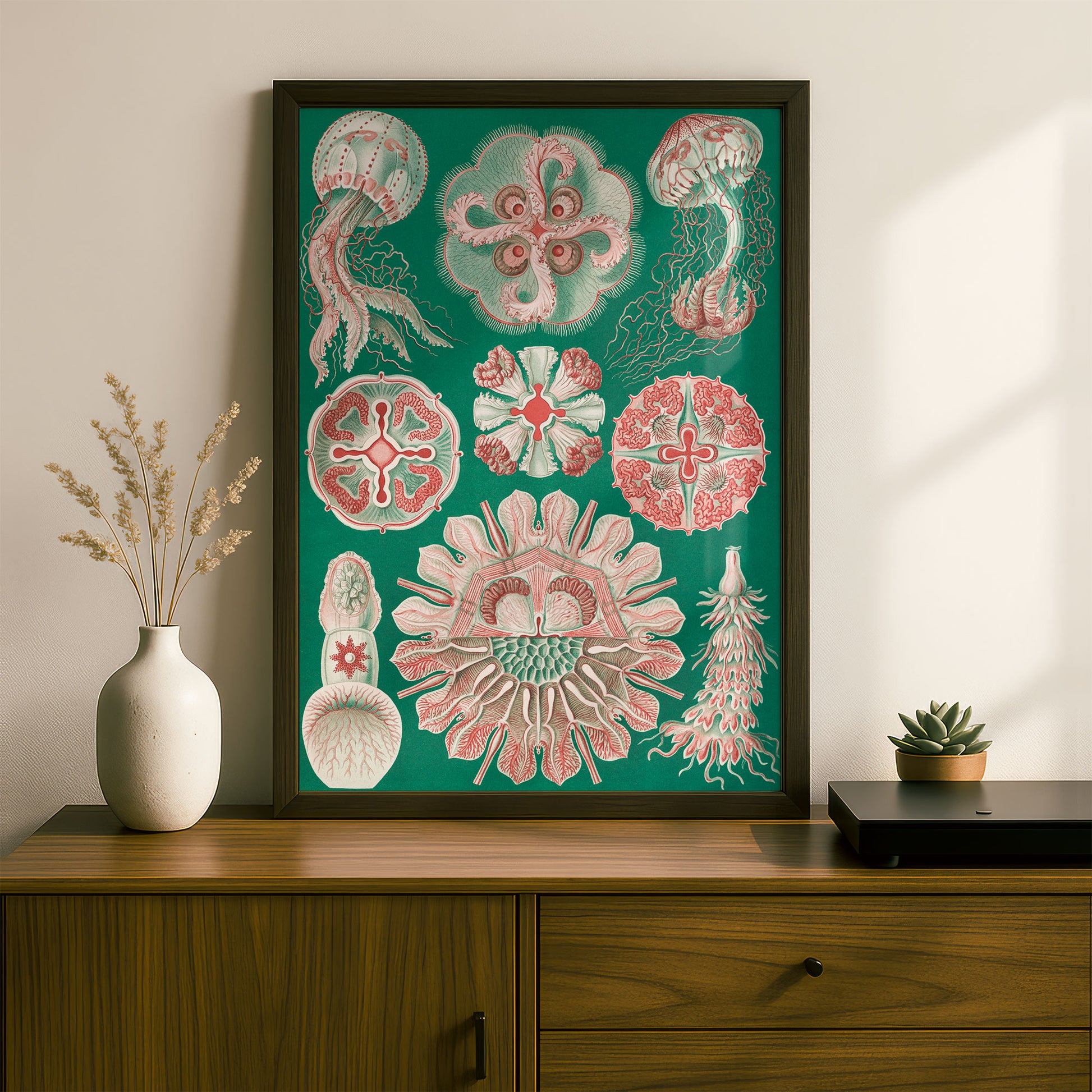 Haeckel's enduring work perfectly marries accuracy and imagination — detailed scientific records rendered with an artist's eye for colour, composition, and drama. His intricate patterns and bold use of colour feel strikingly contemporary, making century-old illustrations of diatoms and sea creatures look like they could hang in any modern space. Whether you're drawn to natural history, love bold graphic design, or simply want something genuinely unique on your walls, Haeckel's work delivers visual impact that never gets old.
